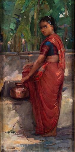 Très populaire auprès du public européen et indien du sous-continent pour son caractère typiquement indien, sa grâce et son lyrisme, Preparing for Puja représente une femme marathe vêtue d’un sari rouge traditionnel, tenant un récipient en cuivre près du puits du village, puisant de l’eau pour ses tâches religieuses et ménagères.